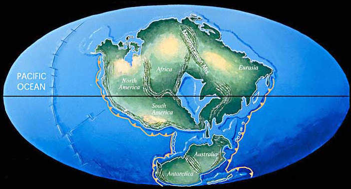 Hace doscientos millones de años, toda la Tierra emergida de nuestro planeta estaba reunida en una sola masa que se llama Pangea (”toda la tierra”). Luego, esa masa única se partió en dos masas más pequeñas, Gondwana y Laurasia.