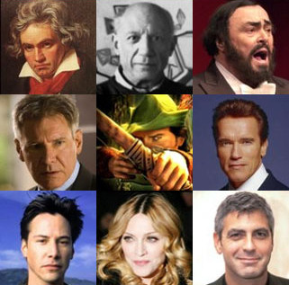 Beethoven, Picasso, Pavarotti, Harrison, Hood, Schwarzennegger, Deep, Madonna, Clooney.