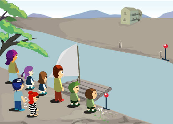 Y el funcionamiento es simple. Elige a dos personajes con el ratón y luego acciona la palanca que hay al lado de la balsa para comprobar si tu elección fue correcta.
