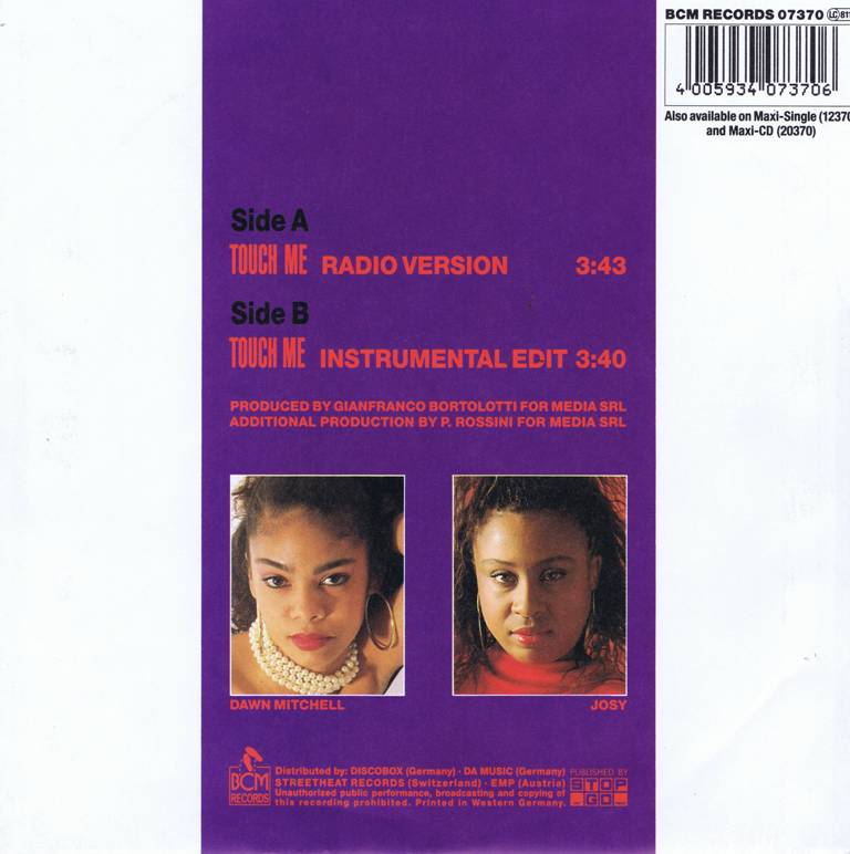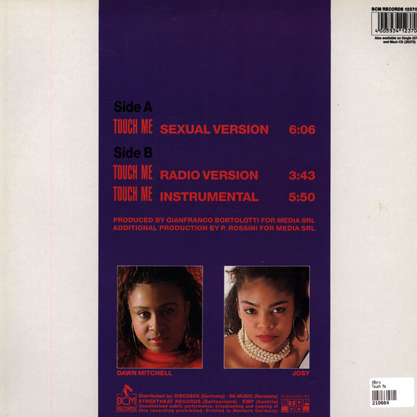 «Touch Me» fue el tercer sencillo que el grupo 49ers publicó en enero de 1990 de su disco «49ers». Esta canción fue la primera de otros cuatro éxitos que la banda logró en la lista de baile estadounidense, permaneciendo dos semanas en el número 1 y un total de once semanas en dicha lista. En Reino Unido logró el puesto 3.
