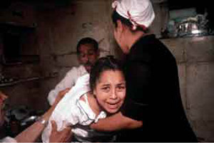 “Recuerdo que un hombre llegó a casa. El hombre poseía unas inmensas tijeras en la mano. Mi abuela y otras mujeres me sujetaron. Aquel hombre puso su mano sobre mi sexo y comenzó a pellizcarlo, como mi abuela cuando ordeñaba las cabras. Entonces las tijeras descendieron entre mis piernas y el hombre seccionó mis labios interiores y el clítoris. Lo pude oír claramente, fue como un «clack», como cuando se corta un pedazo de carne en una carnicería. El dolor que se siente no tiene palabras, me subió por las piernas, no dejaba de aullar y me invadió entera, un dolor imposible de describir. Tras la mutilación, después de que notas cómo la sangre te corre por las piernas, es cuando te cosen. Aquel señor usó una enorme aguja sin punta y con ella remató su faena. La aguja pasó entre mis labios externos”