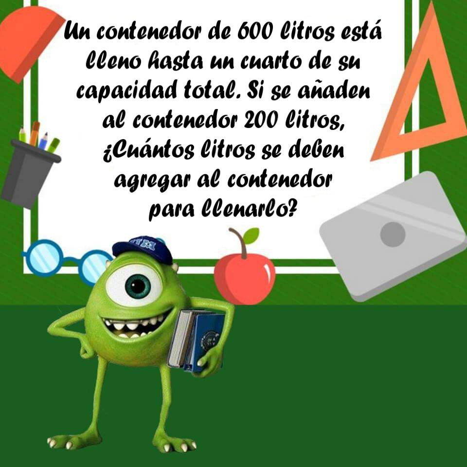El problema matemático dice: «Un tanque de 600 litros de agua está lleno hasta un cuarto de su capacidad total. Si se añaden al tanque 200 litros de agua, ¿cuántos litros de agua falta añadir al tanque para llenarlo?»