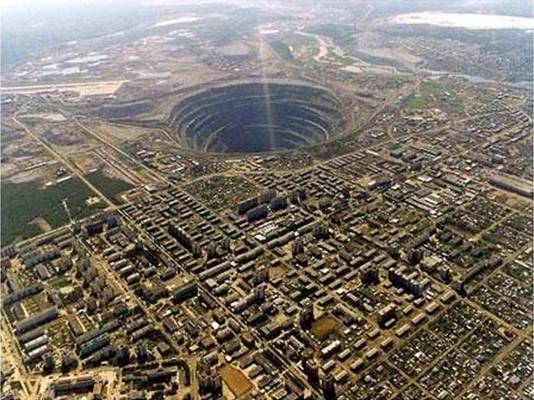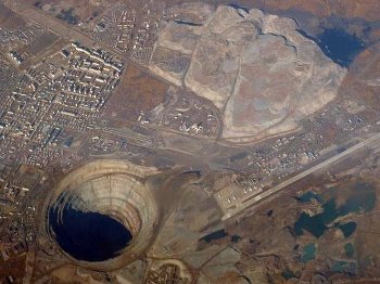 Uno de los agujeros más grandes del mundo está en Mirni (o Mirny), en Siberia, Rusia. Tiene 525 metros de profundidad y 1025 metros de diámetro. En realidad este agujero se ha formado artificialmente debido a que es una mina de diamantes, llamada Mina Mir o Mina de Mirni. Actualmente es el segundo agujero más grande del mundo tras la mina de cobre Bingham Cañon, que está en Utah, Estados Unidos.