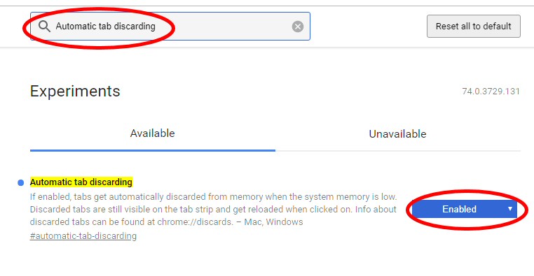 Como existen muchas flags para configurar, es mejor utilizar el buscador que hay arriba del todo para llegar a ellas. Según vayamos escribiendo texto en este buscador, se hará una criba y nos mostrará las opciones que coincidan con ese texto. Vamos a probar con la opción Automatic tab discarding, que tendremos que habilitar para que las pestañas se descarten automáticamente si la memoria RAM está baja. Aunque las pestañas serán visibles, no se cargarán, sólo cuando hagamos clic en ellas.