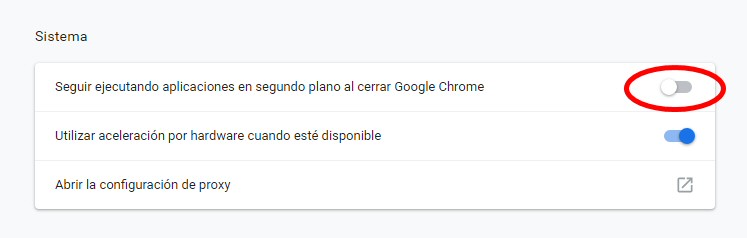 En la lista de opciones, vamos a la sección SISTEMA y deshabilitamos la opción SEGUIR EJECUTANDO APLICACIONES EN SEGUNDO PLANO AL CERRAR GOOGLE CHROME como en la imagen de abajo. Luego reiniciamos Chrome.