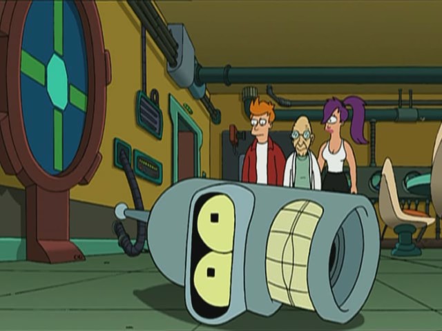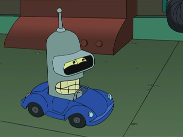 En este episodio de Futurama, «A la cabeza de las elecciones«, Bender vende su cuerpo para ser más rico, y claro, hace de las suyas en “Planet Express”, atemorizando a todo el mundo con su flamante bólido. Uno de los peores defectos de Bender es la egolatría y aquí lo deja constatado.