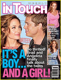 Según la revista In Touch, Angelina Jolie y Brad Pitt, tendrán mellizos, un niño y una niña. Angelina se enteró de la buena nueva, en su última visita a su ginecólogo personal, el Doctor Jason Rothbart, al realizarle una ecografía. Esto confirma lo que ya anunció la revista Star Magazine en Enero.