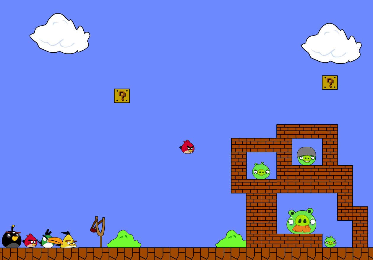 Cuando los personajes de Angry Birds se encuentran en el universo de Mario Bros, algunos toman las ventajas de los escenarios, como los cerdos verdes, que se encierran en paredes de ladrillo.