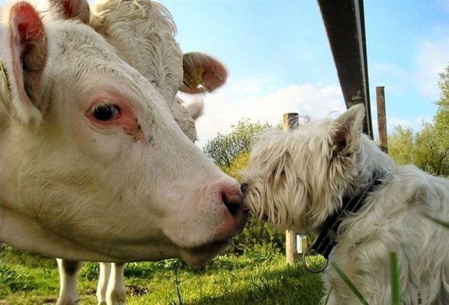 Amor imposible entre una vaca y un perro. Se quieren, pero no tienen futuro…