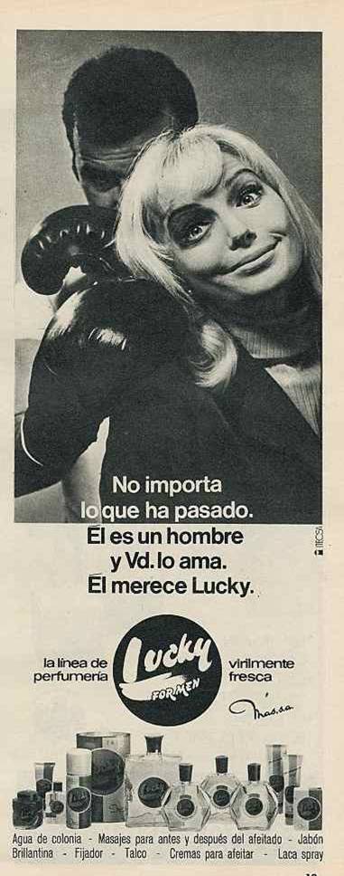 Que barbaridad estas maneras de promocionar los productos….mal… muy mal…creer como ha tenido que evolucionar la humanidad a costa de humillar a la mujer….que bien que ya es historia…me ha llamado la atención el perfume Luky (imaginarese que de por si con ese comportamiento el hombre apesta ni el perfume lo salva….jajajajajaja) y los brommtiks en línea de ropa ni que la mujer fuera una muñeca de trapo….total nada salva a un hombre tosco y grosero.