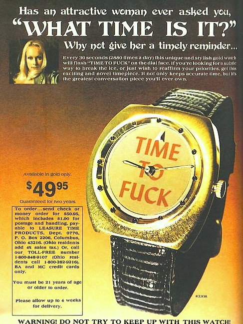 Cada 30 segundos este único y estilizado reloj de oro mostrará el mensaje «Tiempo de follar» detrás de las manecillas. Si buscas una forma sutil de romper el hielo, o quieres simplemente reafirmar tus prioridades, consigue este excitante y original reloj. No solamente mantiene la hora exacta, sino que será el mejor objeto para iniciar conversaciones que hayas poseído.