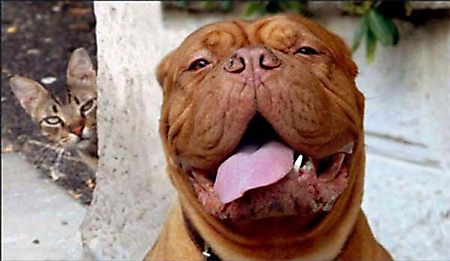 Qué gracia, parece que el gato esté espiando con recelo al perro, que permanece ajeno a la situación.