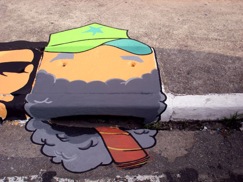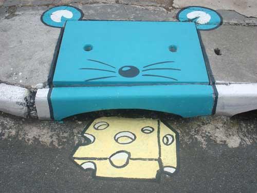Esta es una estupenda forma de animar los arcenes y las calzadas de las grises ciudades, decorando y coloreando las bocas de las alcantarillas con simpáticos dibujos ¿no creéis? Incluso llegan a aprovechar algunos elementos colindantes para dar más vida y asunto al dibujo; la originalidad al poder…