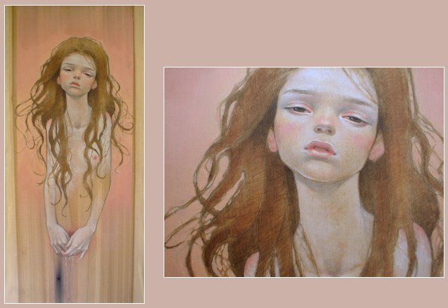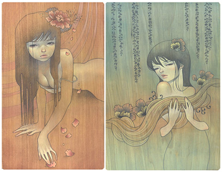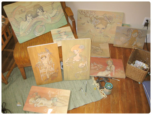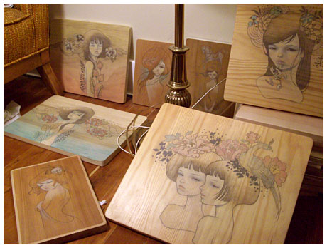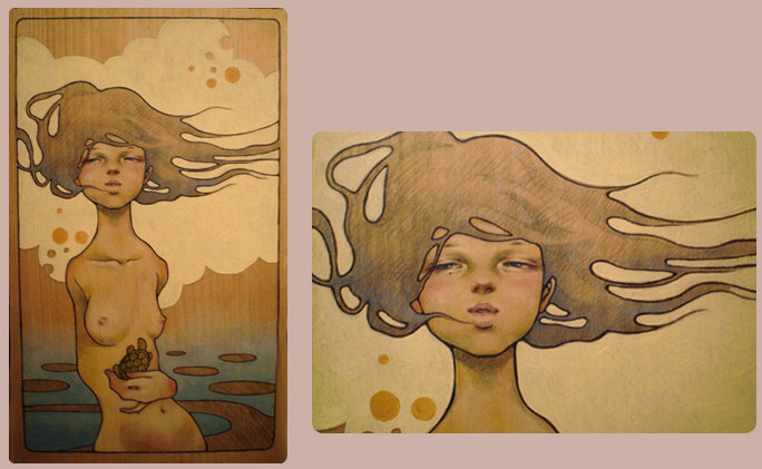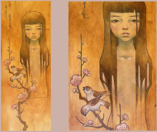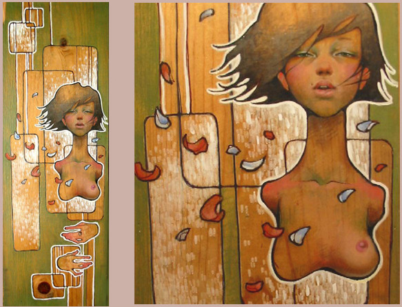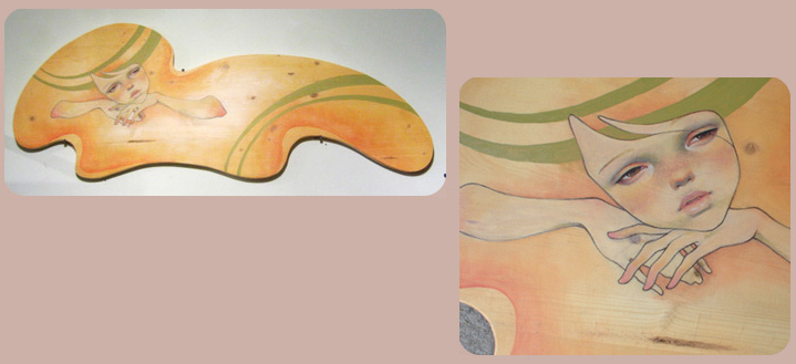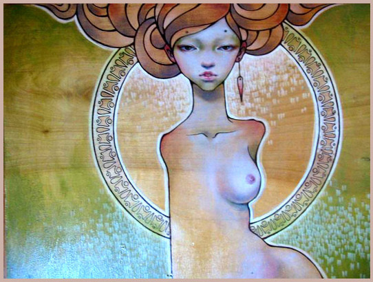 Audrey Kawasaki es una artista que trabaja sobre madera, papel u ordenador, y usa técnicas como la acuarela o la tinta, aunque es más bien conocida por sus trabajos sobre madera.