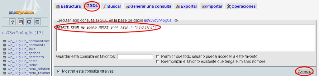 (Si la tabla wp_posts tiene un prefijo diferente, debemos escribirlo con ese prefijo. En mi caso por ejemplo, la tabla se llama wp_88gu8h_posts, y yo tendría que escribir DELETE FROM wp_88gu8h_posts WHERE post_type = «revision»; Cada uno tendrá un nombre diferente, aunque el común es wp_posts.)