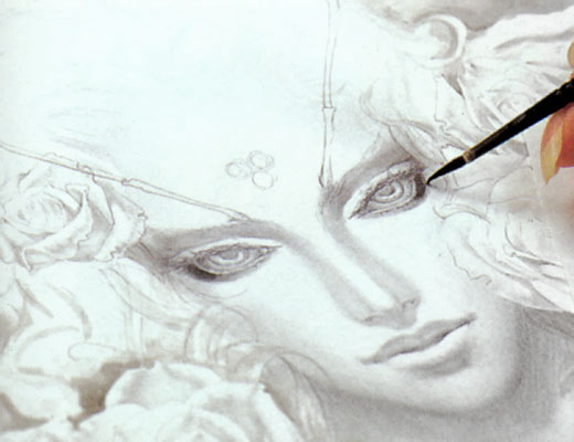 El boceto y la composición recaen en el lápiz. Las sombras se oscurecen en monocromo usando tanto carboncillo como tinta china. La composición de color queda entonces fijada usando acrílicos diluidos. Y los aspectos de textura tridimensionales presentes en la mayoría de sus pinturas, se logran usando pasta de modelar y una espátula.