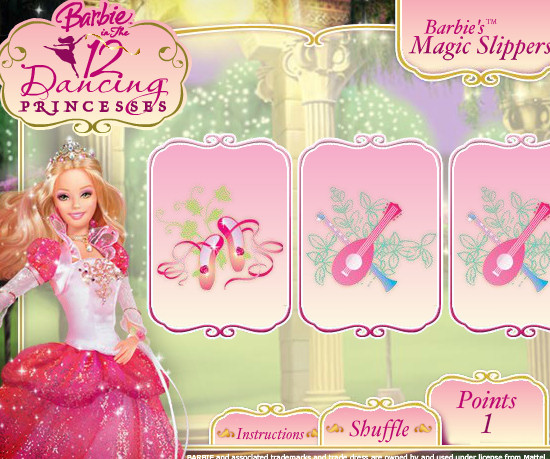Nuestra Barbie Bailarina se enfrenta al reto de encontrar la carta con las zapatillas mágicas entre un grupo de cartas de laudes y flautas. Debes prestar atención cuando las cartas se mezclen para no perder de vista la carta con las zapatillas mágicas. De lo contrario, Barbie no podrá bailar esta noche con el ballet.