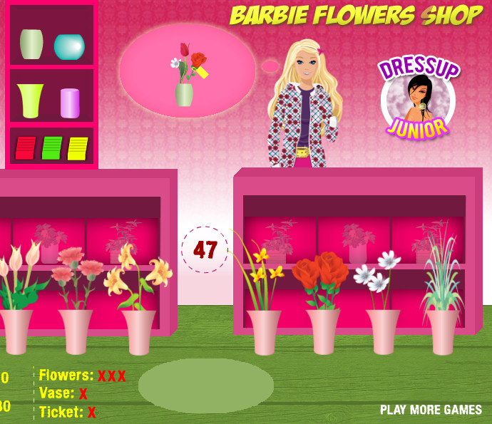 Por fin Barbie tiene su propia floristería y puede crear estupendas macetas y centros florales o adornos con flores y tallos de plantas. Los clientes irán pidiendo una creación y Barbie tendrá que copiarla empleando la misma maceta, mismos tallos, mismas flores y e igual tarjeta de felicitación. Date prisa porque el tiempo se acaba y hay que ser rápido.