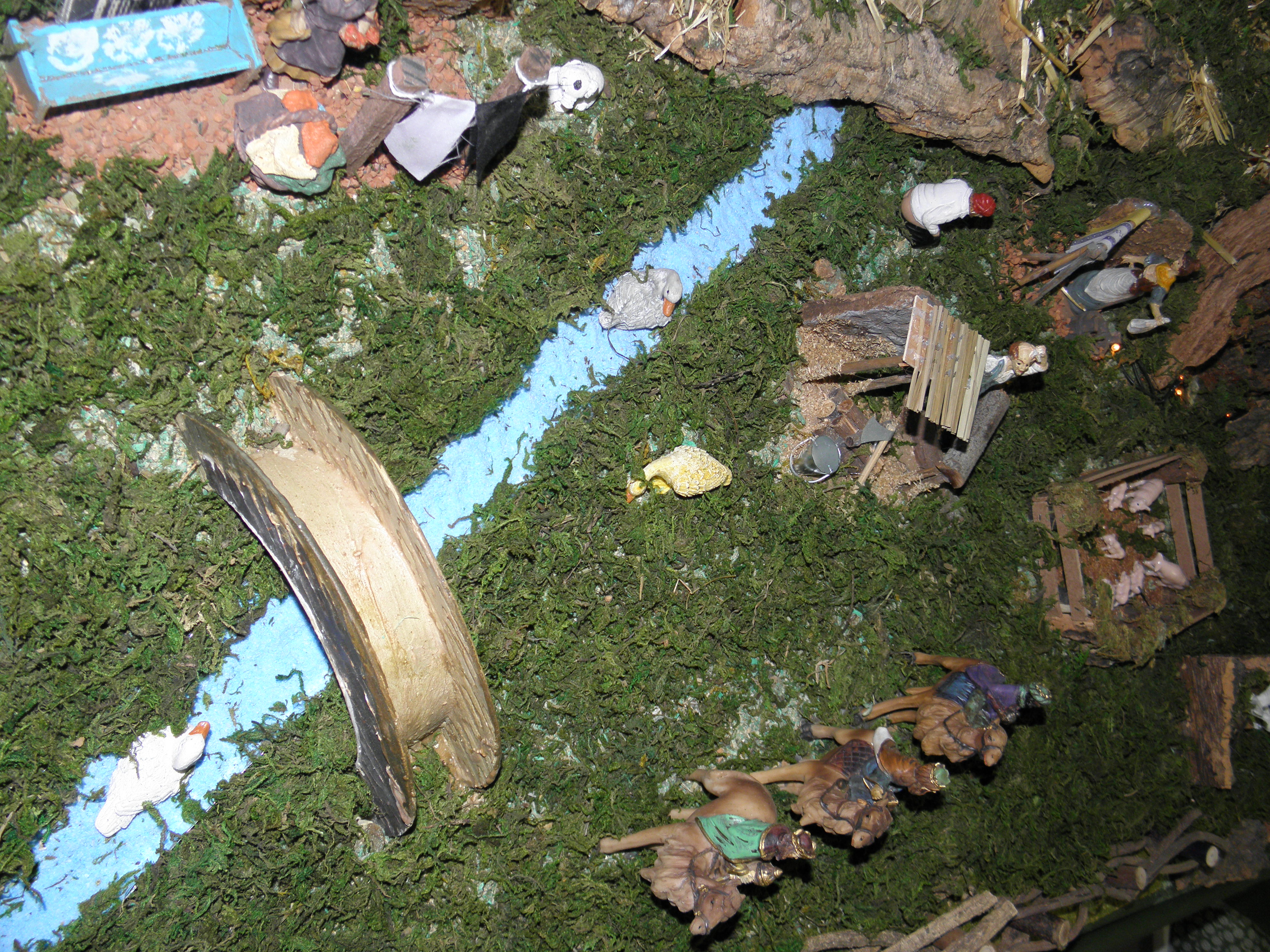 También he puesto un río que he hecho con sal pintada con tiza azul. El fallo que tiene bastante gordo es que hay dos grupos de Reyes Magos: unos en el Nacimiento, y otros a camello más pequeños. Debe ser por el ansia de poner todas las figuritas que había XD.