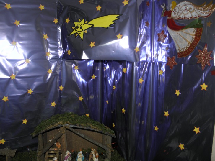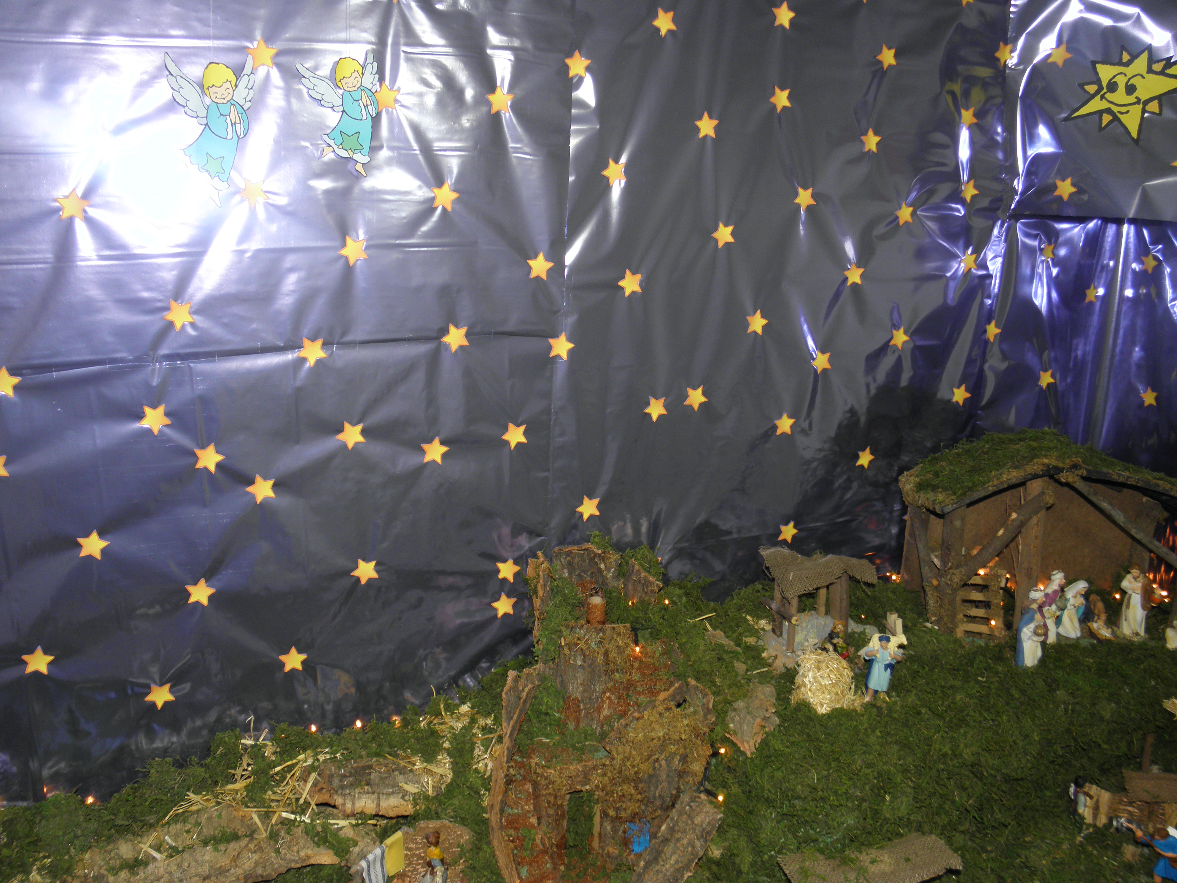 También puse un fondo de estrellas que imprimí y fui recortando para pegarlas una a una sobre el fondo, aparte de poner varios elementos dispares, como angelillos de papel, una estrella guasona, y unas palomas y otro ángel de pegatina.
