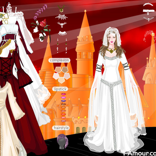 En este juego podrás vestir a la princesa, que celebra su boda en el castillo. Podrás peinar, maquillar y escoger entre los muchos vestidos y trajes para dejar a esta novia guapísima y que su enamorado el príncipe se case con ella. Entre los complementos, tienes flores o joyas como diademas, tiaras, coronas, gargantillas, collares o pendientes.