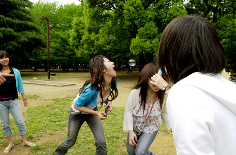 Aquí tenemos unas chicas jugando con pompas de jabón en el parque Yoyogi Koen, cosa que no resulta rara salvo porque las pompas son comestibles.