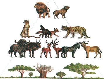 Un tercer nivel trófico consiste en los carnívoros primarios (como los lobos), que comen herbívoros, y un cuarto en los animales (como las orcas) que comen carnívoros primarios (superdepredadores). Finalmente, al final de la cadena alimentaria, están los animales (como los buitres y algunos insectos) que consumen plantas y animales muertos.