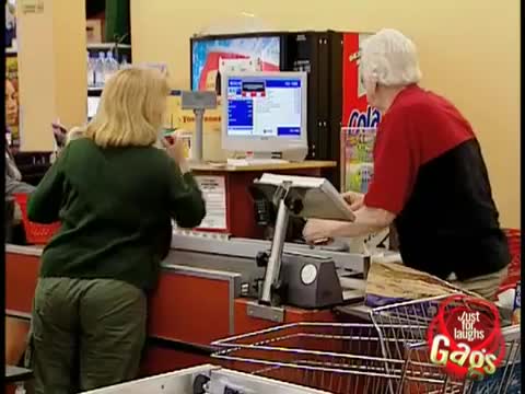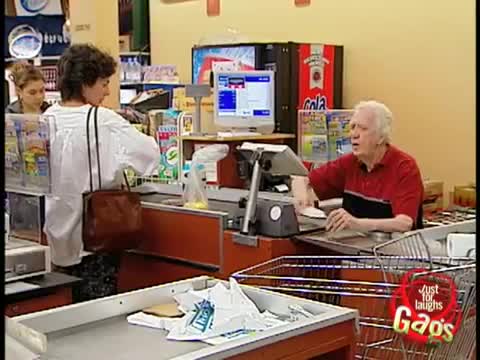 En esta broma de Just for Laughs, podemos comprobar porqué no hay muchos cajeros de avanzada edad. Las personas que se ponen en esa caja, maldicen su mala suerte cuando observan cómo al hombre le entran los tembleques y cobra varias veces cada artículo. La gente mira para los lados, buscando a alguien a quien quejarse, mientras en el monitor de la caja aparecen repetidos los cobros de los artículos. Y para rizar el rizo, muy buena la actuación de este hombre con parkinson cuando empieza a mirar en el monitor los errores que les señalan los clientes.