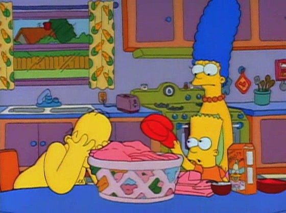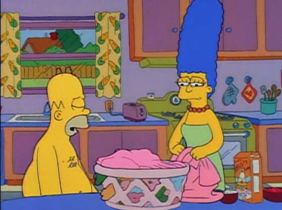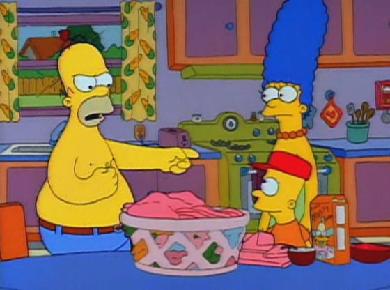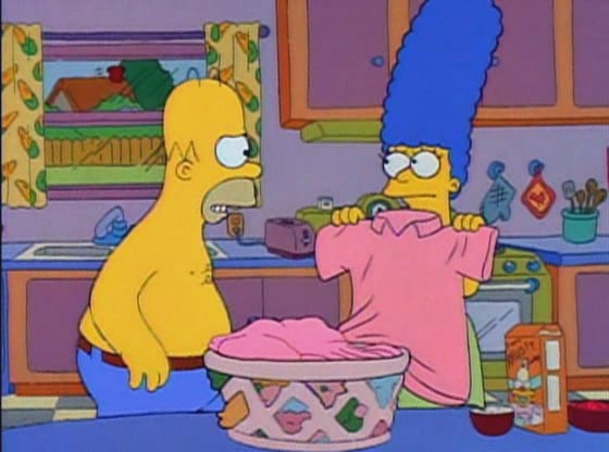 En este fragmento del episodio primero de la tercera temporada de los Simpson, «Papá loco», podemos ver cómo a Homer le ocurre un percance, cuando la gorra roja de la suerte de Bart, tiñe el resto de la colada de rosa, entre ellas, las camisas del trabajo de Homer.