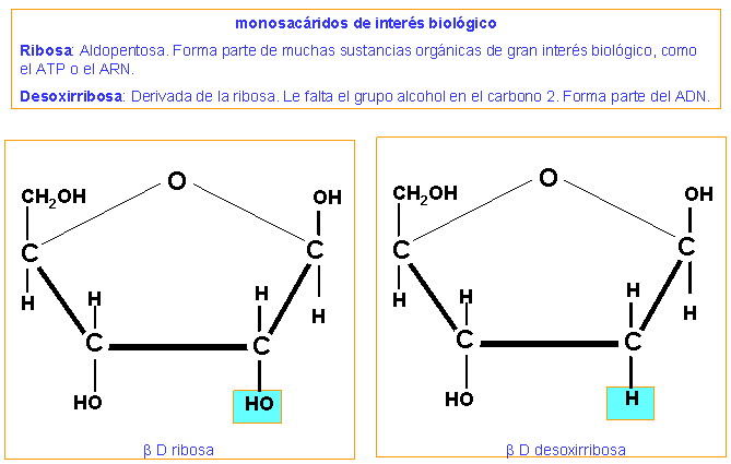 Otro azúcar importante es la ribosa, esquematizada más abajo. Si un átomo de oxígeno es extraído de la ribosa, como se muestra en la imagen de la derecha, entonces la molécula es de ribosa sin oxígeno, o desoxirribosa.