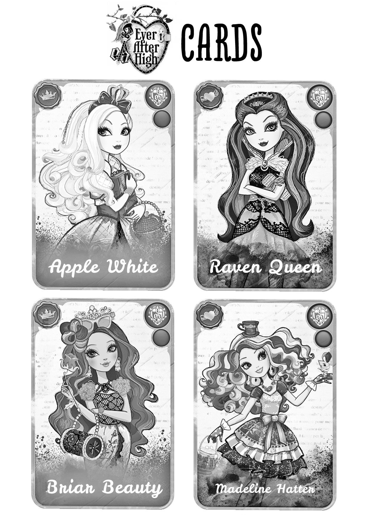 Qué emocionante, ¡más cartas de personajes de Ever After High para colorear! En esta ocasión podremos pintar los personajes en las cards con sus nombres. Dos Reales y dos Rebeldes: Apple White, Briar Beauty, Raven Queen y Madeline Hatter a tu disposición para ser coloreadas con todos los utensilios que emplees. Guarda la imagen en tu ordenador, imprímela y luego dale los colores adecuados. ¡A pintar se ha dicho!