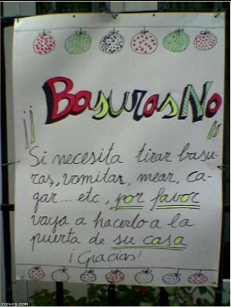 La gente es muuu guarra: «¡¡Basuras no!! Si necesita tirar basuras, vomitar, mear, cagar… etc, por favor vaya a hacerlo a la puerta de su casa. ¡Gracias!»