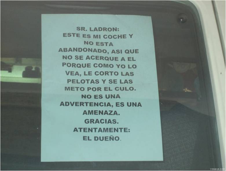 A ver quién tiene lo que hay que tener, para acercarse al coche de este hombre: «Sr. Ladrón. Este es mi coche y no está abandonado, así que no se acerque a él, porque como yo lo vea, le corto las pelotas y se las meto por el culo. No es una advertencia, es una amenaza. Gracias. Atentamente, el dueño»