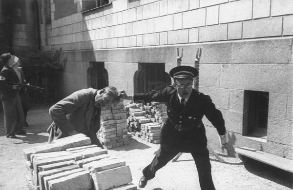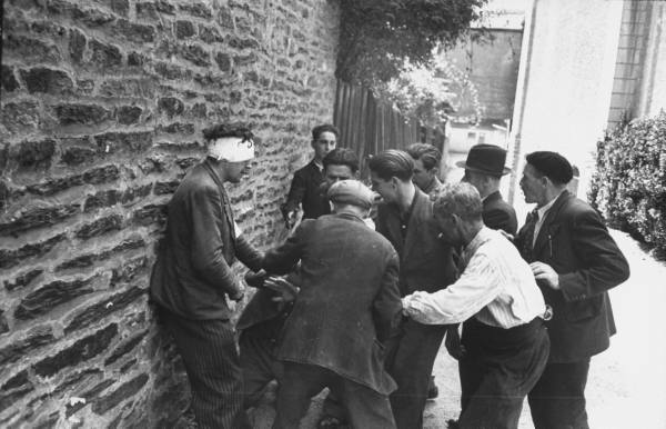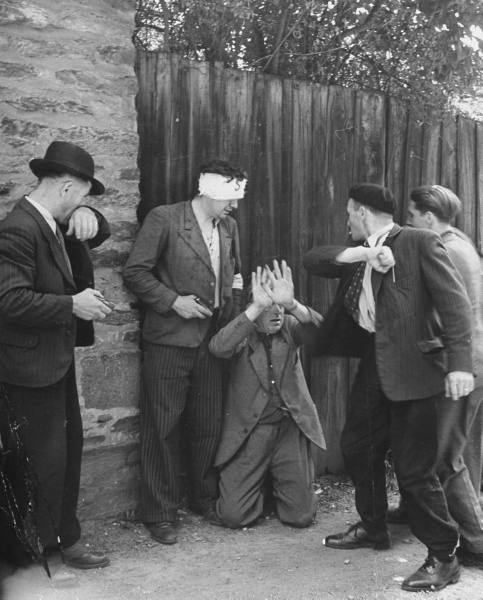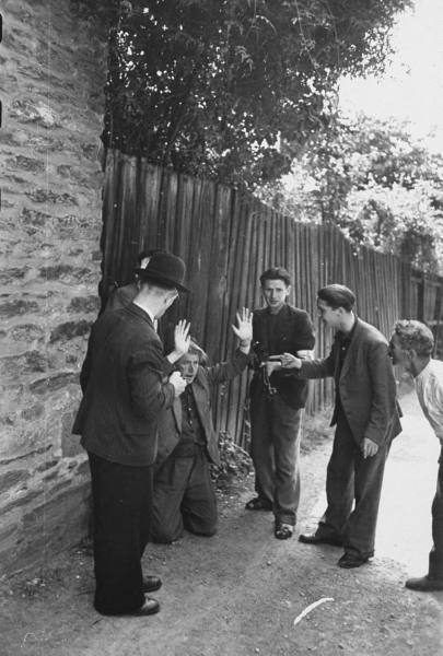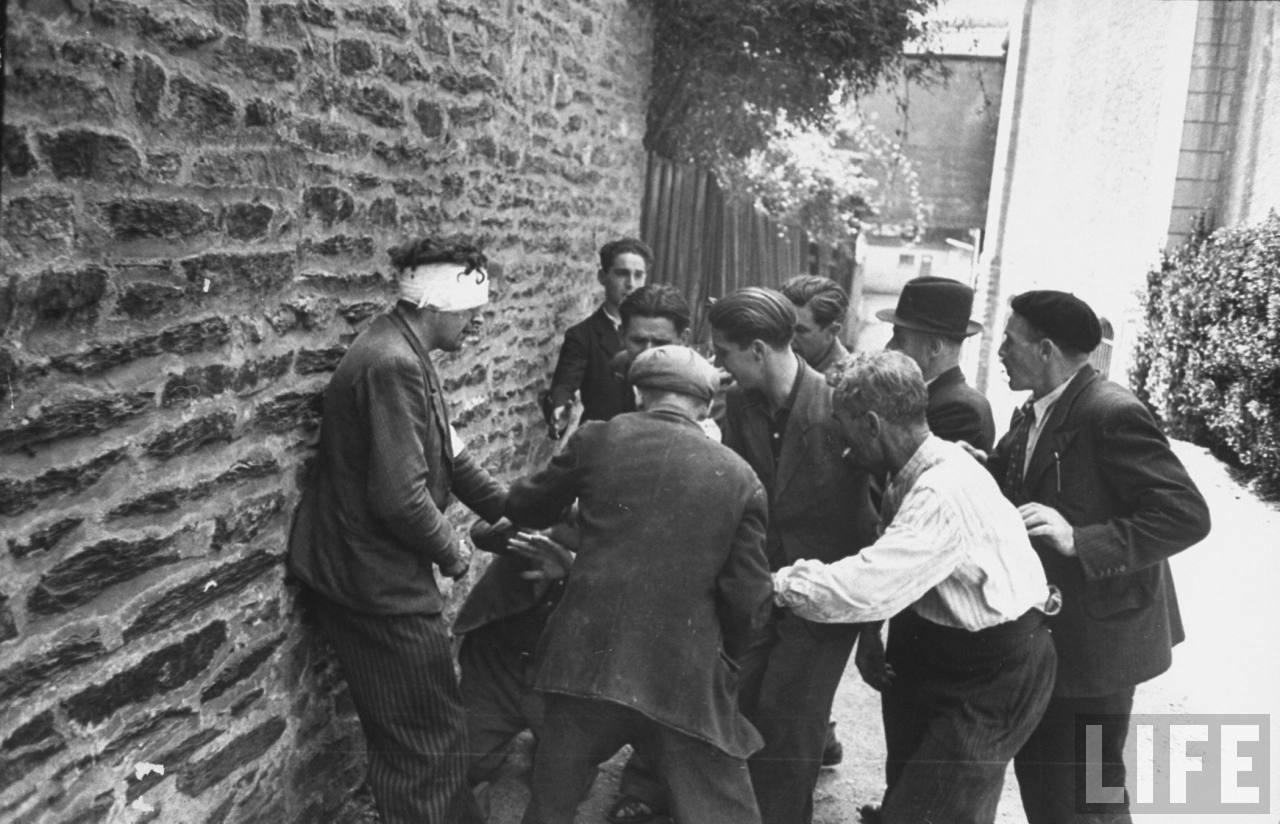 Cuatro patriotas franceses, terminada apenas la liberación de Rennes, atacan a un colaboracionista que se arrodilla implorando piedad e intenta cubrirse el rostro antes de que le propinen una paliza. Fotos por Bob Landry para la revista Life. Imagen en mayor resolución.