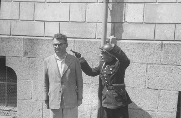 Soldado apuntando a la cabeza de un colaboracionista apresado en la liberación de Rennes.