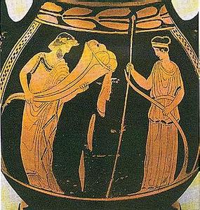 No era permitido a los hombres asistir a dichas fiestas. Se celebraban éstas por espacio de cinco días, durante los cuales algunas doncellas vírgenes, vestidas con túnicas blancas, transportaban sobre sus cabezas, de Atenas a Eleusis, las sagradas canastillas que contenían un niño, una serpiente de oro, un harnero, algunos pasteles y otros símbolos.