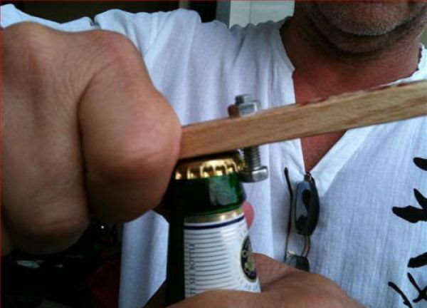 Ni navajas suizas, ni ocho cuartos. Este tablón con tornillo es un estupendo abrebotellas.