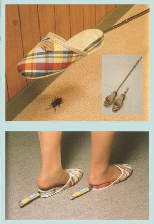 ¿Tienes cucarachas en casa? Pues déjate de venenos o sprays, y usa la fuerza bruta. Cuando veas una, puedes usar el mango acoplable para iniciar el novedoso sistema de acercamiento sigiloso, donde la cucaracha, ignorante de su destino, recibirá el peso de la ley. Y cuando no estés de patrulla cucarachil, las zapatillas se convierten en una seductora prenda de vestir para recibir a los invitados en casa.