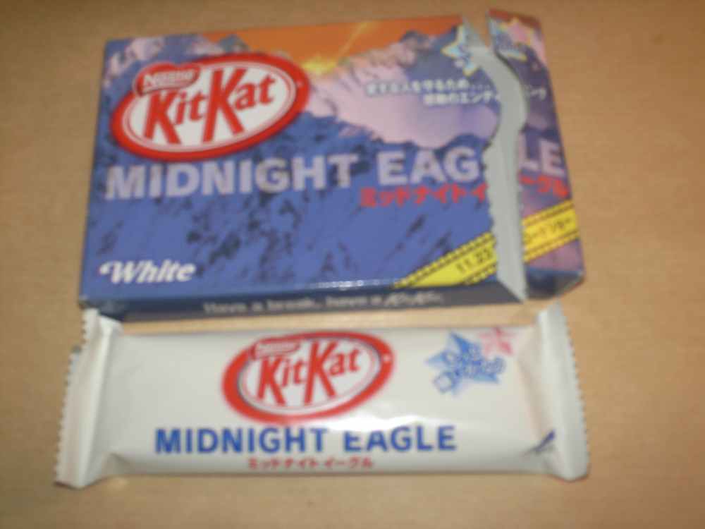 Kit Kat Midnight Eagle (¿Aguila de Medianoche?). Son de chocolate blanco, muy buenos, que encima te dejan un regusto a esos Petit Suisse blancos, por lo que intuyo que aparte de ser de leche, deben tener alguna reminiscencia a queso. Los que más me han gustado.