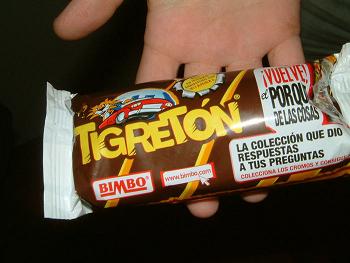Tigreton. Pastelito cilíndrico de chocolate con crema blanca como de nata enrollada en el interior.