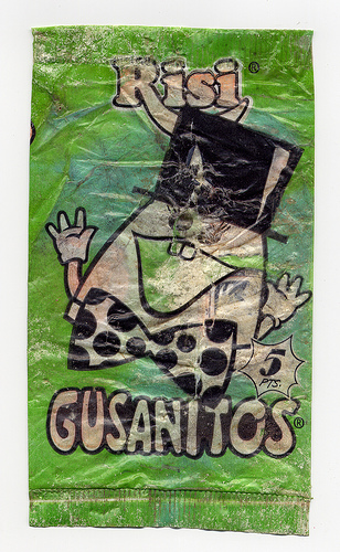 Gusanitos de maíz Risi, la marca líder, aunque habían también de otras marcas «la pava». Inequívocamente, la bolsa verde estaba asociada a estos gusanitos, una de las opciones más baratas y que llenaban más el estómago de los pequeñajos.