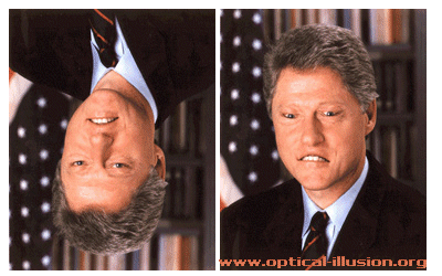En la foto de la izquierda parece que Clinton está sonriendo, pero si le damos la vuelta, en realidad nos damos cuenta que su cara está mostrando otra expresión más estrambótica.