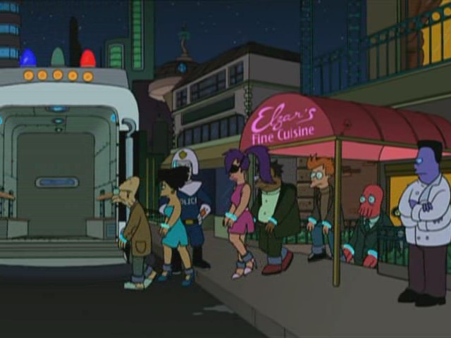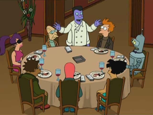 Otro fragmento correspondiente al fabuloso episodio de “Bender ingresa en la mafia”. Después de que Elzar deja ciega a Leela, les invita a una comida en su restaurante, aunque luego descubren que lo de invitar, nanai de la China.