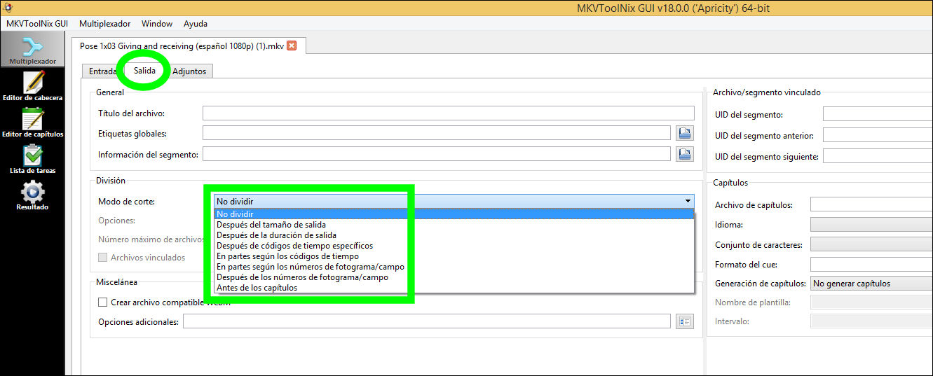 Este corte es muy útil si el MKV viene especificado por capítulos marcados. Simplemente escribiremos los números de los capítulos, y conseguiremos varios vídeos nuevos dependiendo de esos cortes.