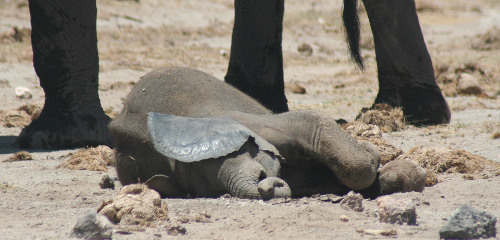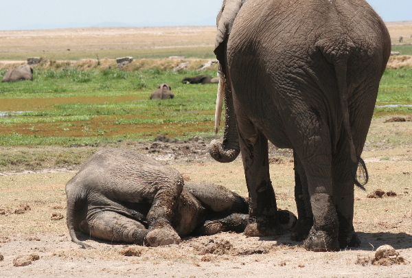 Los bebés elefantes, ya que pesan menos, suelen dormir algo más de tiempo. Así, no es raro ver a la madre velar con paciencia el sueño de su retoño a su lado. Si el bebé se excede en el tiempo perjudicial, la madre le despierta para que se levante.