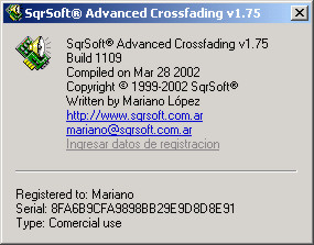 Vamos a OPTIONS > PREFERENCES > Sección de PLUG-INS > OUTPUT > seleccionamos el SQRSOFT ADVANCED CROSSFADING y pinchamos en el botón ABOUT. Ahí podemos elegir la opción INGRESAR DATOS DE REGISTRACIÓN. Estos son los datos: