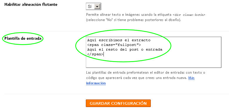 Luego, en cada entrada o post que hagamos, debemos separar la parte que es el extracto, que se ve siempre, y la parte restante, que sólo se verá al leer los posts individuales. Para ello, utilizaremos los códigos <span class=»fullpost»> y </span> como se muestra en el ejemplo de abajo.