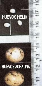 Según la clase de caracol, ponen unos 50 u 80 huevos los caracoles Hélix (huevos de 3mm.), 200 huevos los caracoles chinos o 700 huevos los caracoles africanos Achatina (huevos de 10mm.). Pasados de 16 a 30 días según sea la benevolencia del clima, los huevos eclosionan y nacen las caracolitas.