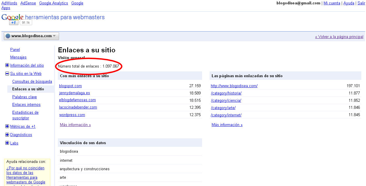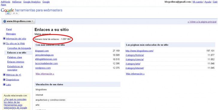 Y nos fijamos en el número que figura al lado de NÚMERO TOTAL DE ENLACES. Ese es el número de enlaces entrantes según Google. Como se ve, difiere mucho de los datos que arroja Yahoo Site Explorer, así que más bien nos sirve para comparar varios sitios que tengamos o bien para ir comprobando en el futuro si el sitio sigue una curva óptima consiguiendo enlaces entrantes.