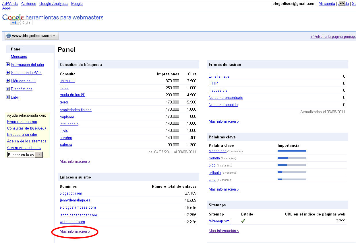 Luego le damos al enlace MÁS INFORMACIÓN de la sección «Enlaces a su sitio«.